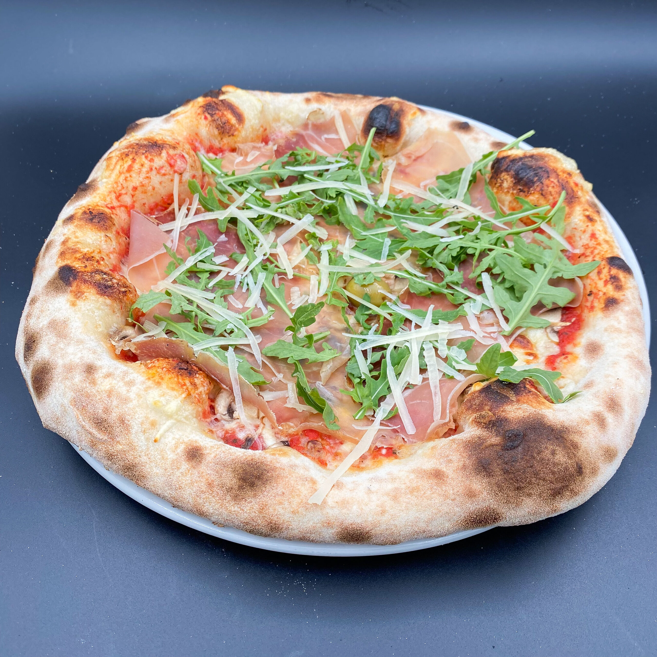 pelati, sir, pršut, gobe, rukola, parmezan