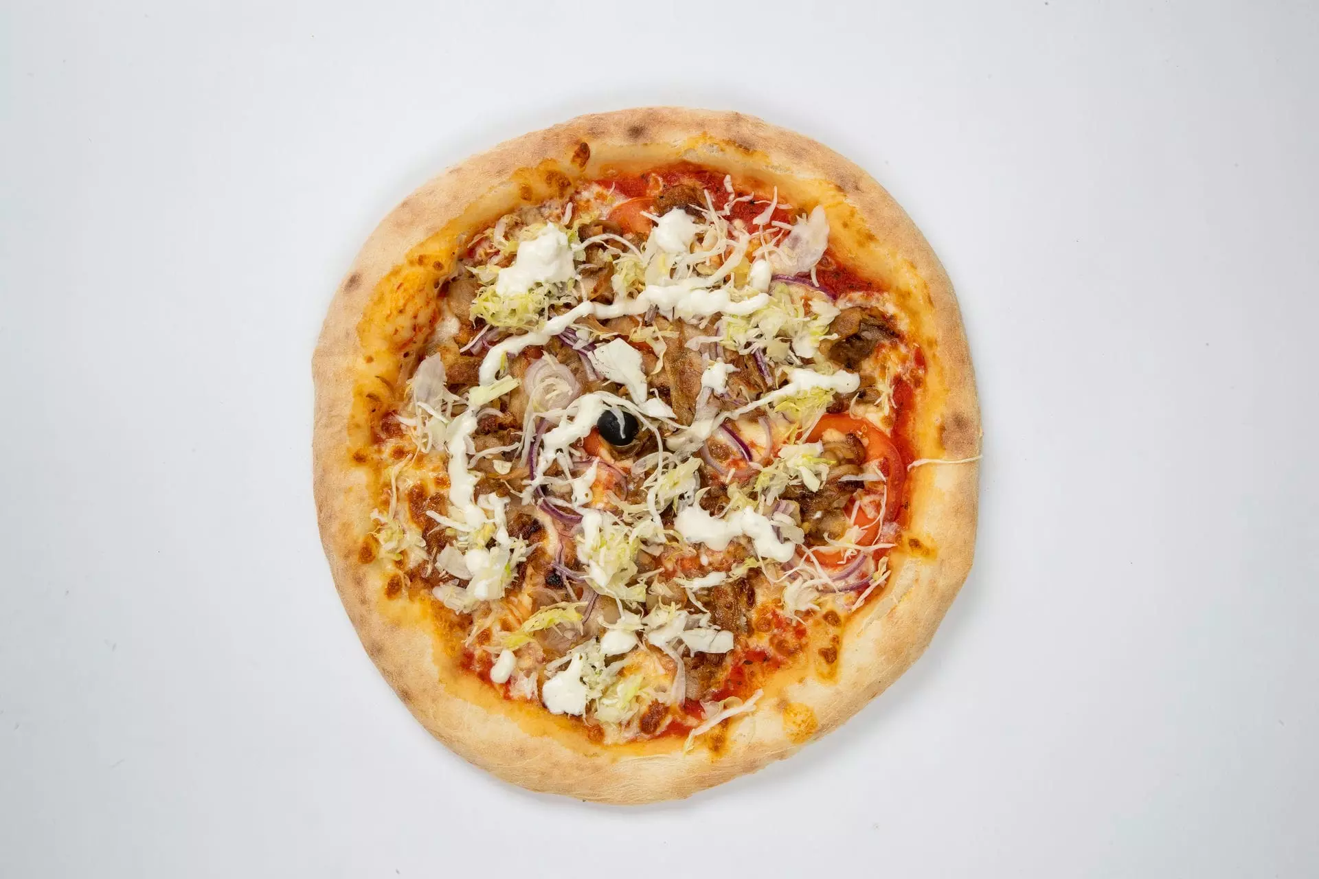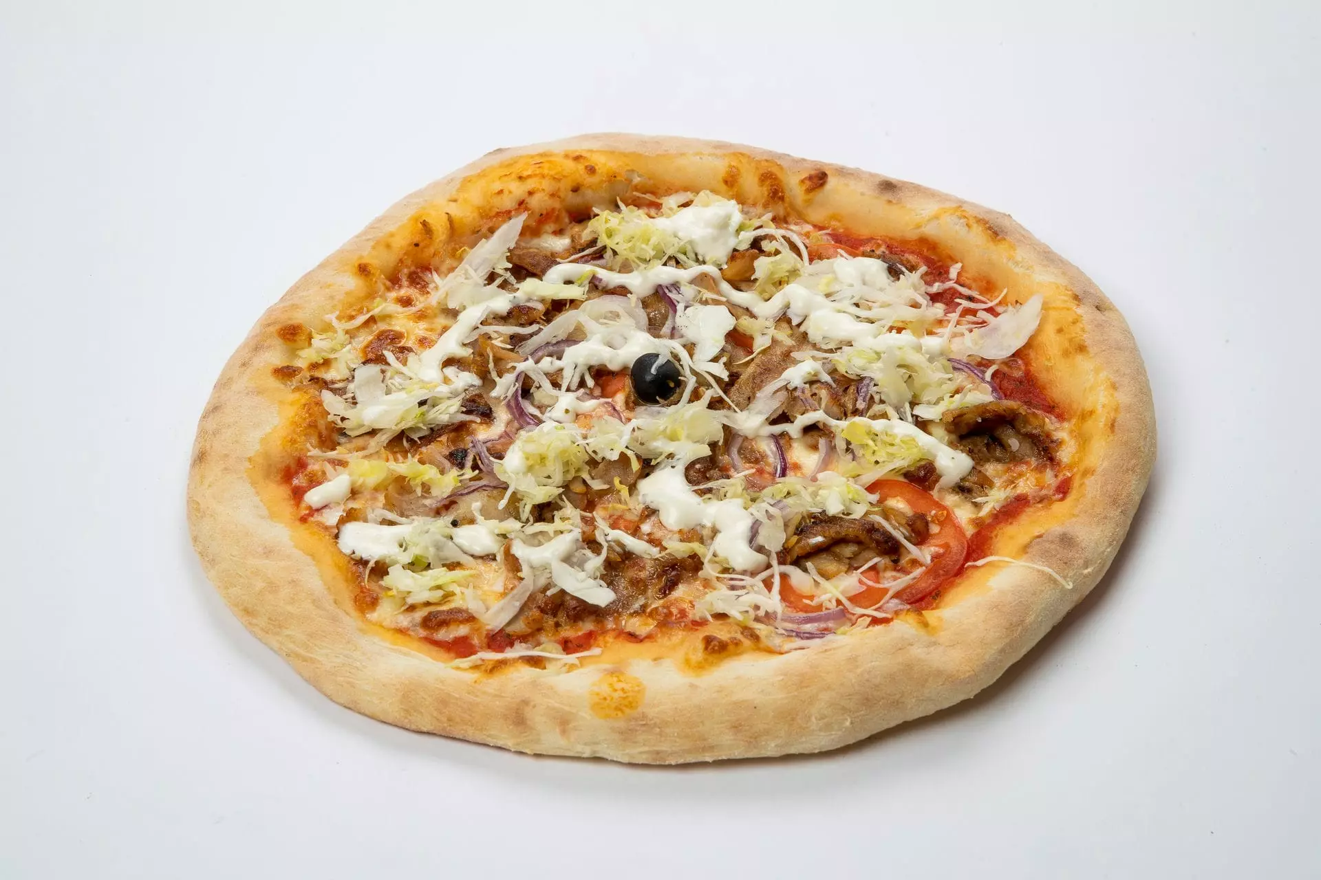 pelati, mocarela, rdeča čebula, paradižnik, kebab meso, zelje, kebab omaka