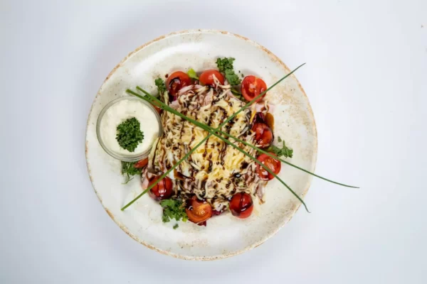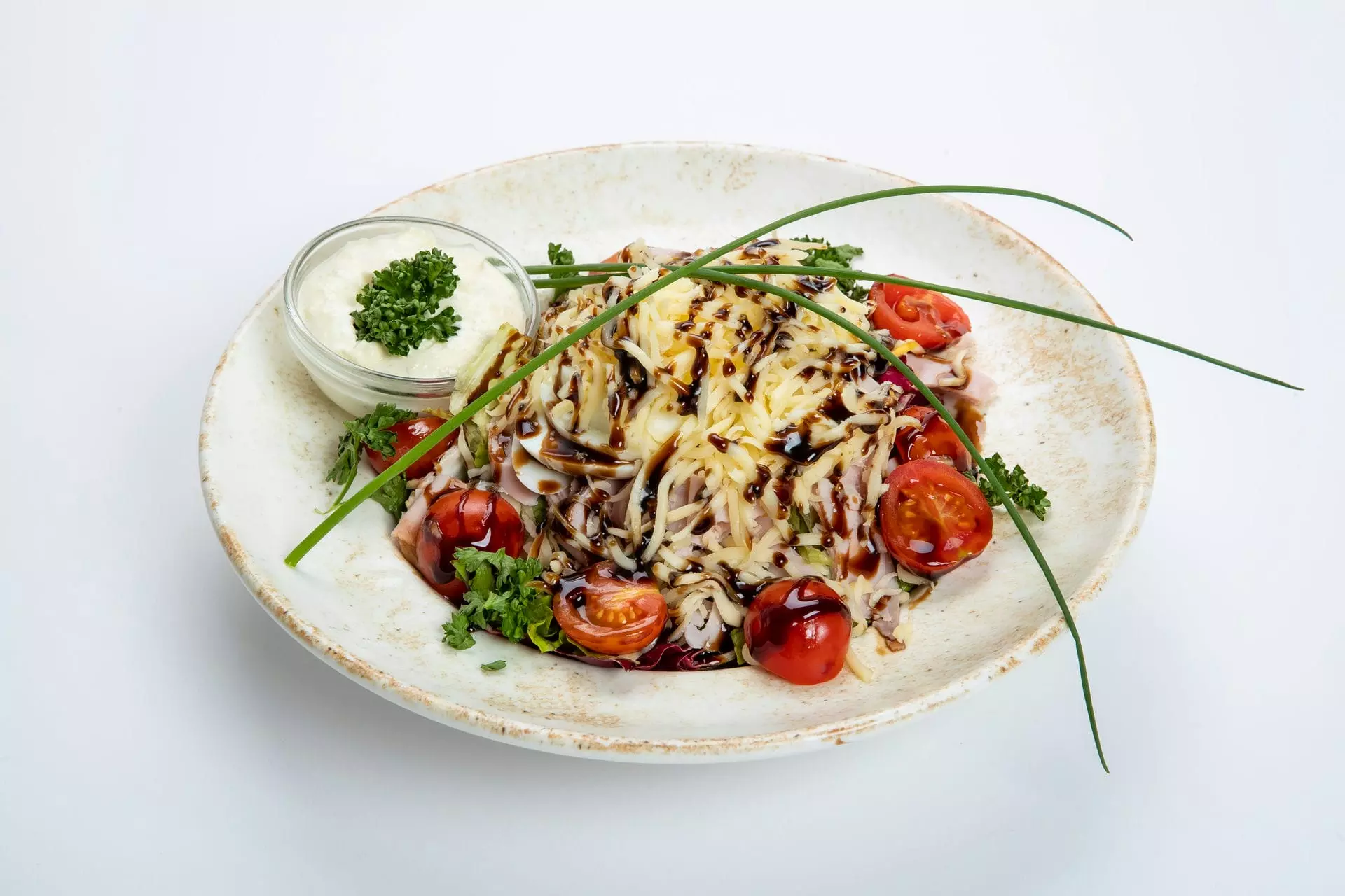 Sestavljena solata z zelenjavo, sirom, šunko, jajcem in tatarsko omako