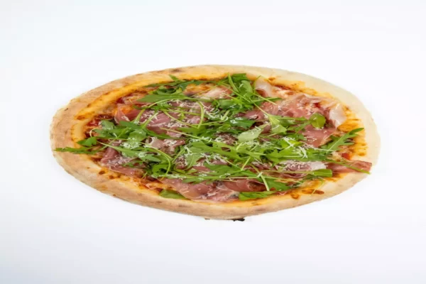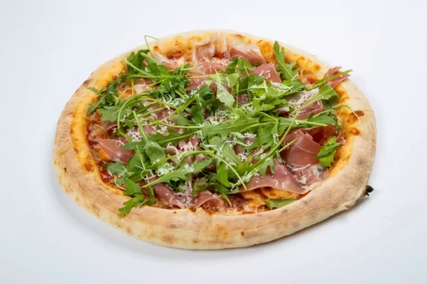 Pelati, mocarela, pršut, gobe, oliva, rukola in parmezan