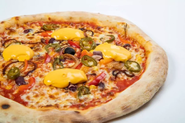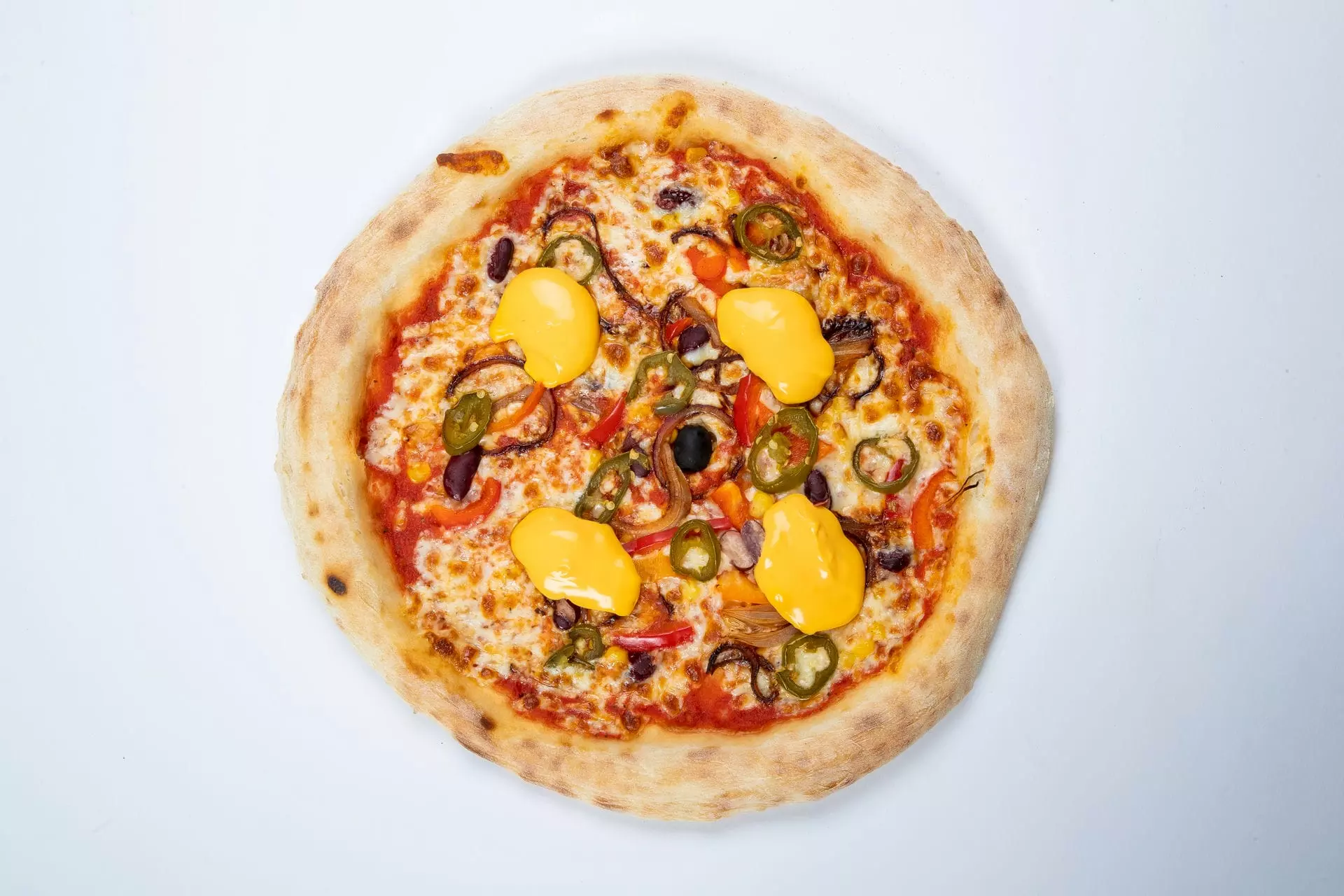 Pelati, mocarela, nacho sir, koruza, paprika, fižol, rdeča čebula in feferoni