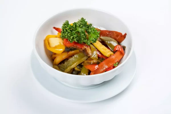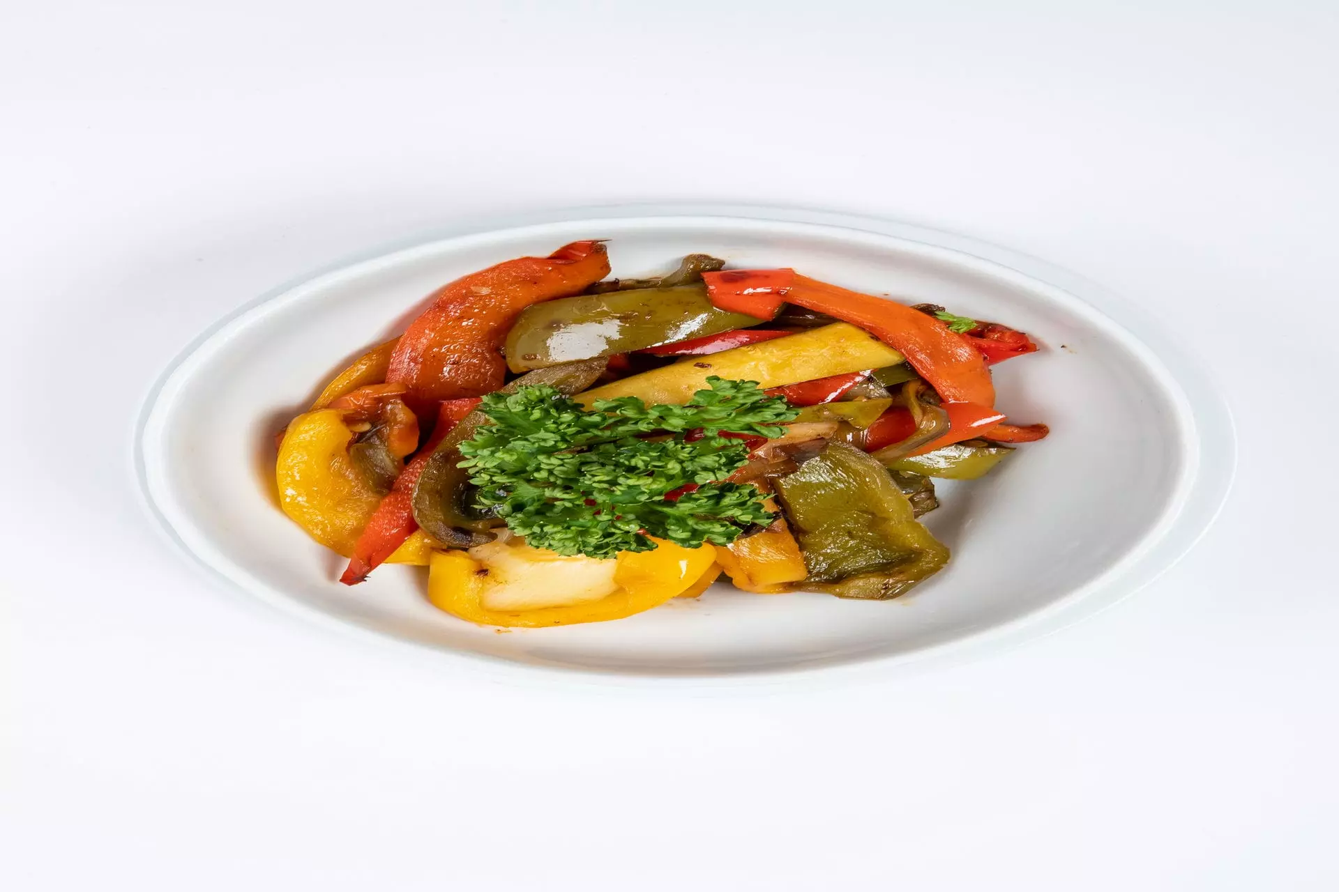 Avocados with crab meat, red onion, crab salad stuffed red bell pepper and green bell pepper.