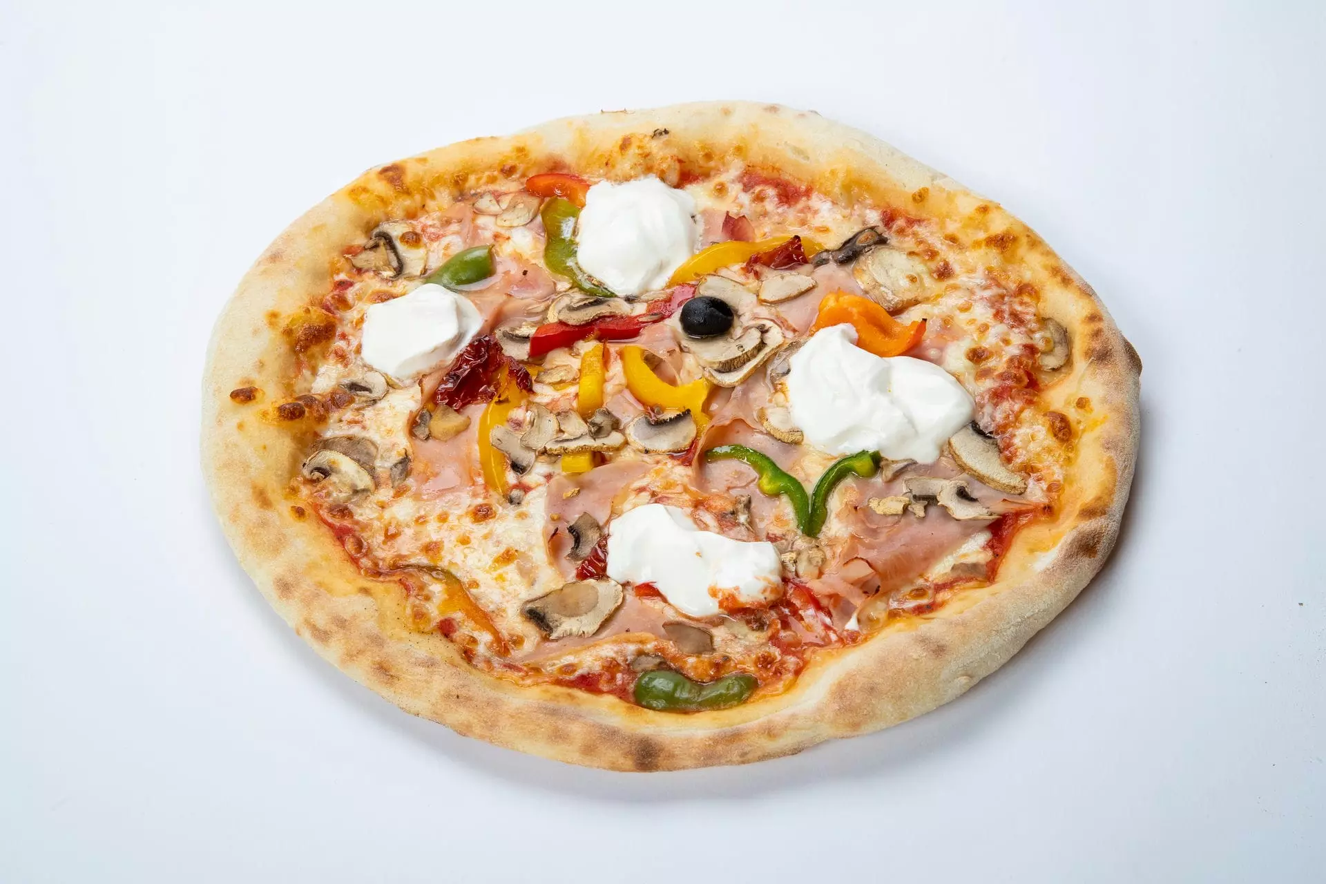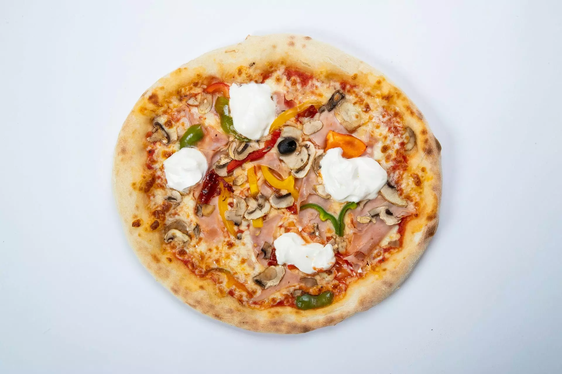 Pelati, mocarela, šunka, gobe, sušen paradižnik, rdeča paprika in kisla smetana