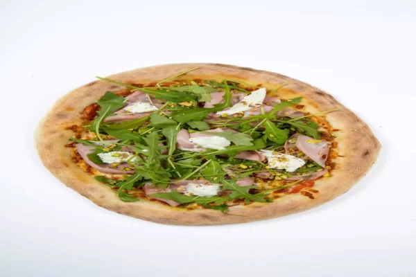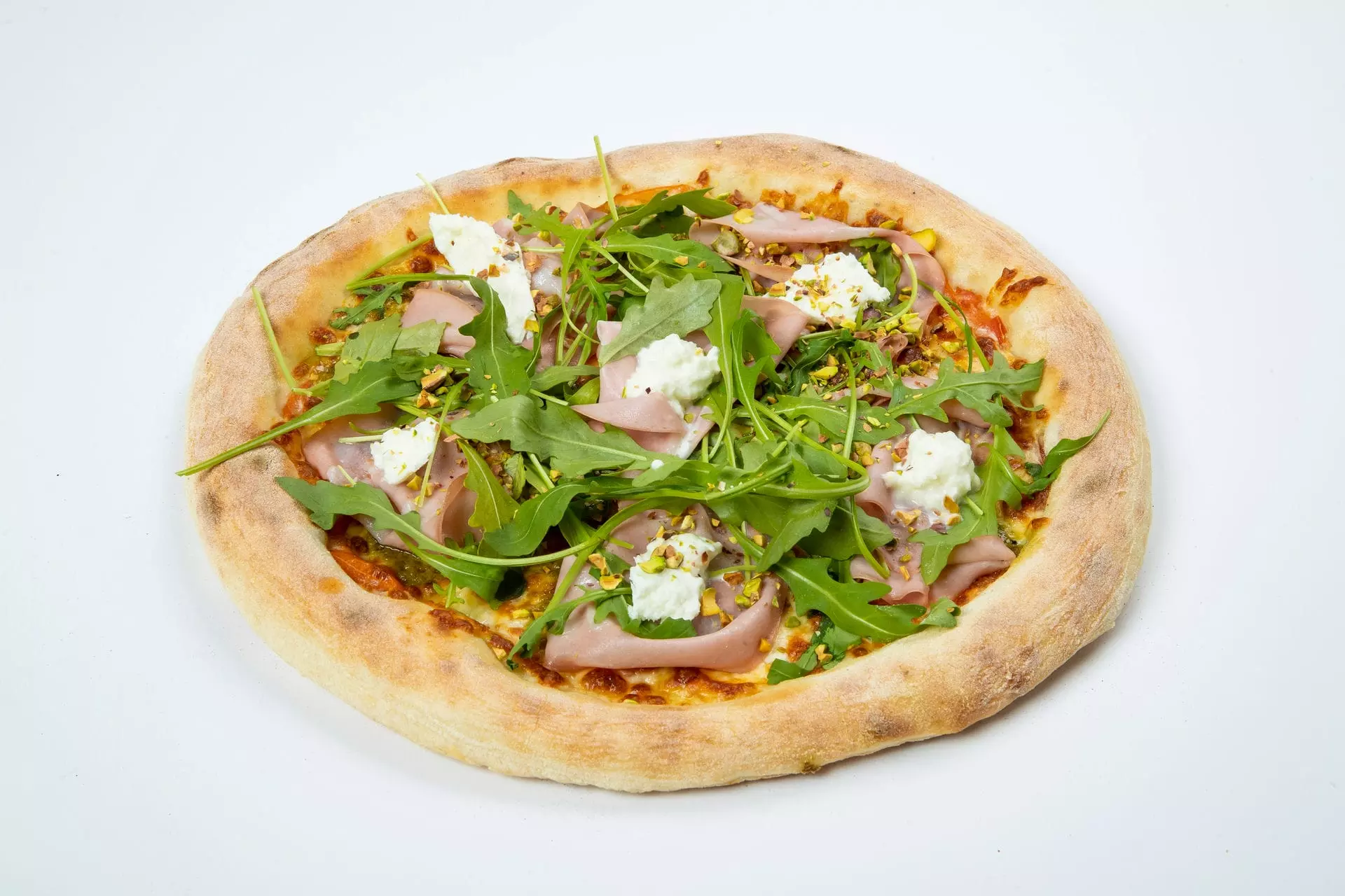 Paradižnik, mocarela, parmezan, mortdela, buffala, drobljena pistacija, bazilika, rukola, olivno olje